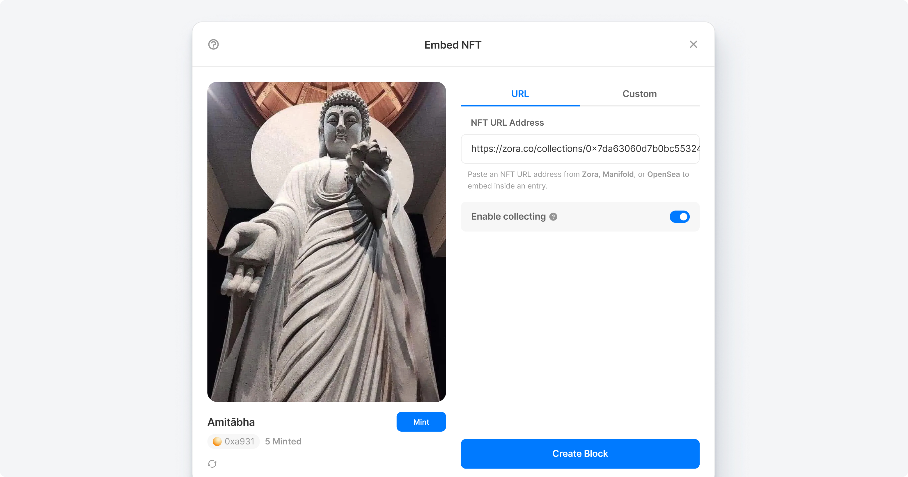 Creation is as easy as pasting the URL in your editor, or adding custom details for specific tokens in collections.