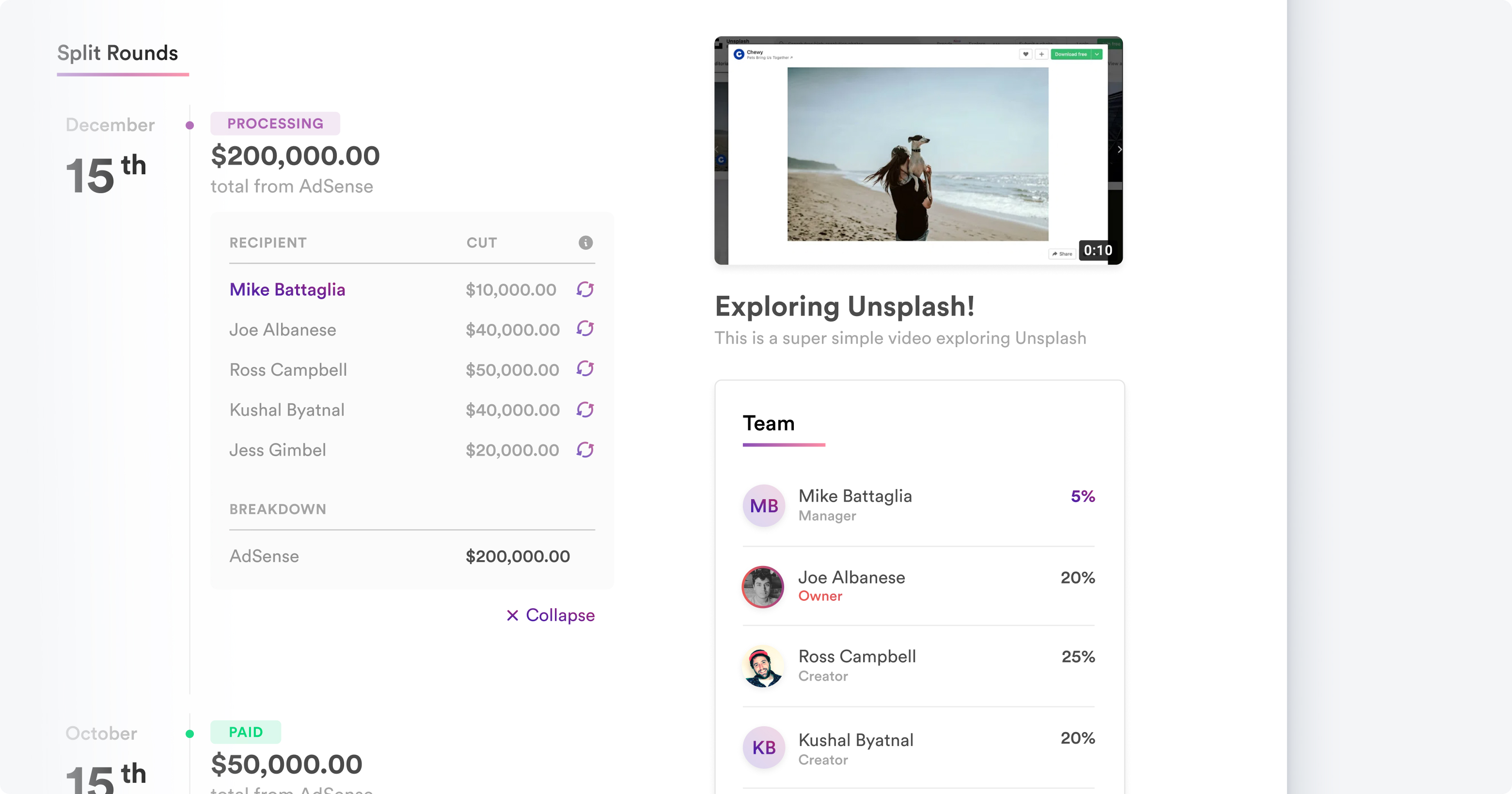 The Splits dashboard keeps revenue sharing transparent, letting creators know who's being paid out and who's earning their cut for the corresponding pay period. Contributor titles, roles, and ownership are also clear to get the whole picture of your collaboration.